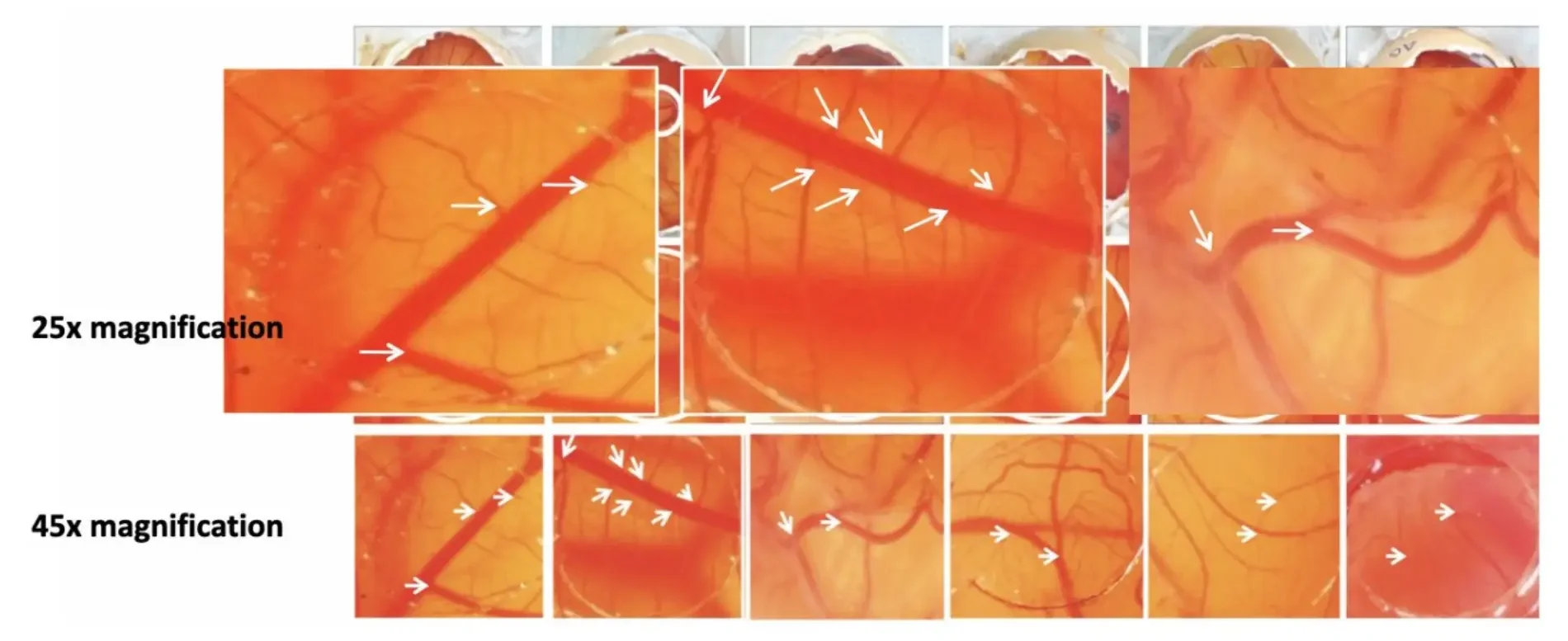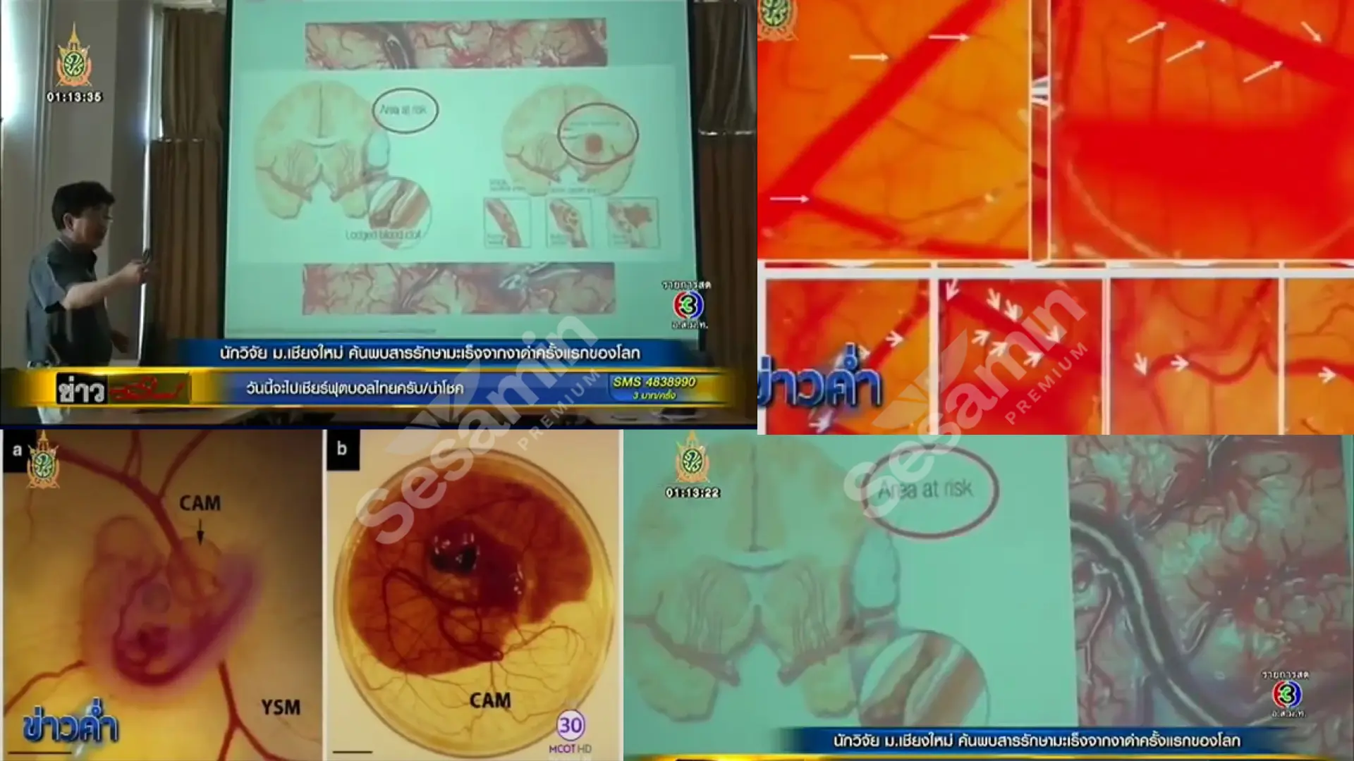 เราได้ทดลองนำสารที่เซลล์มะเร็งผลิตขึ้น ฉีดเข้าไปในไข่ที่ฝากตัวอ่อนของเซลล์มะเร็งอายุหนึ่งสัปดาห์ ซึ่งเหมือนสิ่งมีชีวิตพบว่ามีการสร้างเส้นเลือดขึ้นมามากมาย