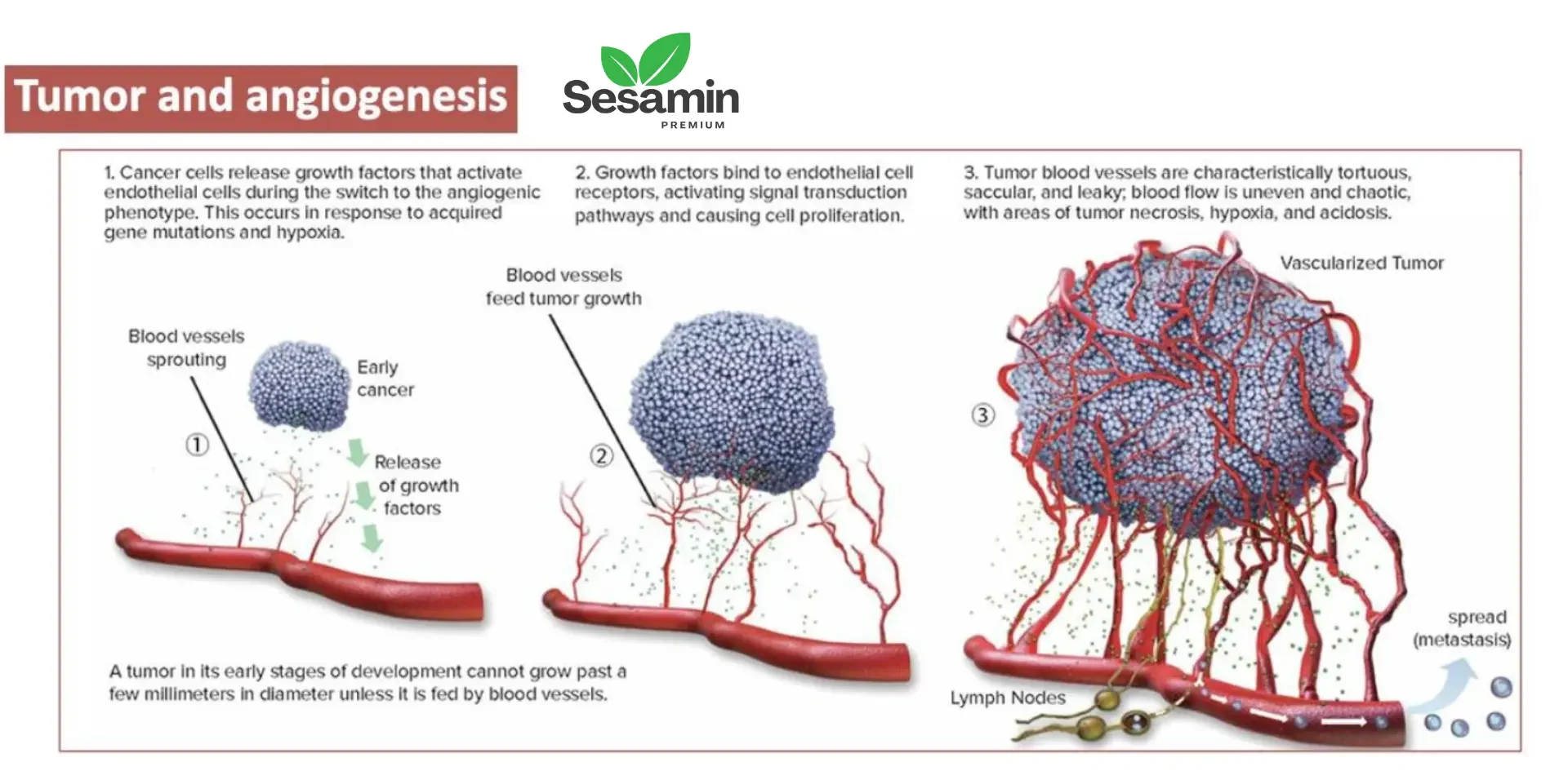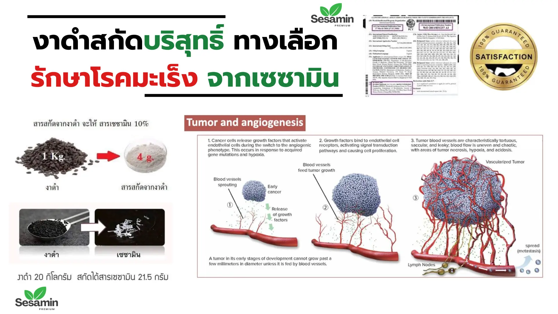 1.เซลล์มะเร็ง คือเซลล์ที่อยู่ในร่างกายเรา ที่มีการแบ่งตัวอย่างรวดเร็ว หลังจากที่เซลล์มะเร็ง มีการกระจายตัว มันสามารถส่งสารไปกระตุ้นให้เส้นเลือดงอกเส้นเลือดมาที่ตัวก้อนมะเร็ง แล้วส่งอาหาร จากทางเส้นเลือดเพื่อไปเลี้ยงก้อน มะเร็ง จากการศึกษา ในหลอดทดลองจากห้องแลป เซซามิน(Sesamin) สารสกัดงาดำ ไปปิดกั้นการสร้างเส้นเลือดใหม่ ที่จะไปหล่อเลี้ยงเซลล์ มะเร็ง ทำให้เซลล์มะเร็งไม่ได้รับอาหาร